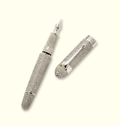 Chcącym wyróżnić się z tłumu polecam piękne pióro AURORA DIAMANTE. To ręcznie wykonane pióro zostało pokryte platyną i diamentami o masie 30 karatów. Stalówka w dwukolorowym osiemnasto-karatowym złocie dostosowuje się do stylu pisma swego właściciela. Dodatkowym atutem jest możliwość umieszczenia na niej herbu, podpisu czy też nawet małego portretu. Jak podkreśla przedstawiciel De Beers tylko jedno takie pióro na rok zostaje wystawione do sprzedaży.