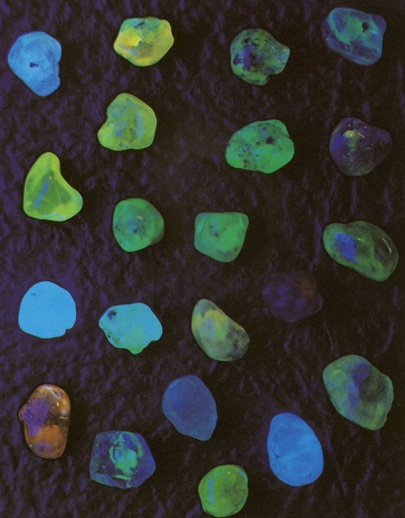 Fluorescencja diamentów - surowe diamenty w świetle UV